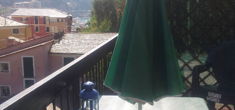 Blaues Zimmer mit Balkon und Meerblick, privates Badezimmer.
