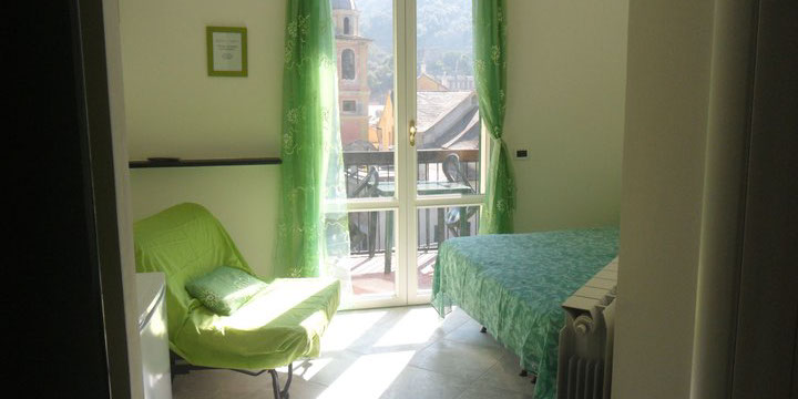 Grünes Zimmer mit Kaffeemaschine und Frühstück mit Besteck.